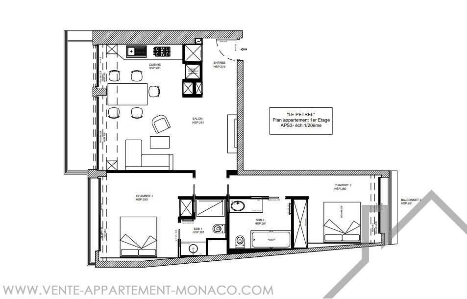 It is composed of : an entrance hall, a living room with an open kitchen and a terrace, two bedrooms and two bathrooms.