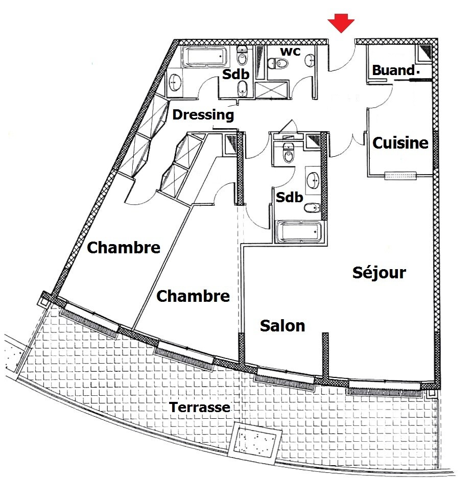 Entrance hall, kitchen, laundry, double living room, two bedrooms with dressing rooms and bathrooms en-suite, guest toilet, air conditioning, double glazing, very large terrace.