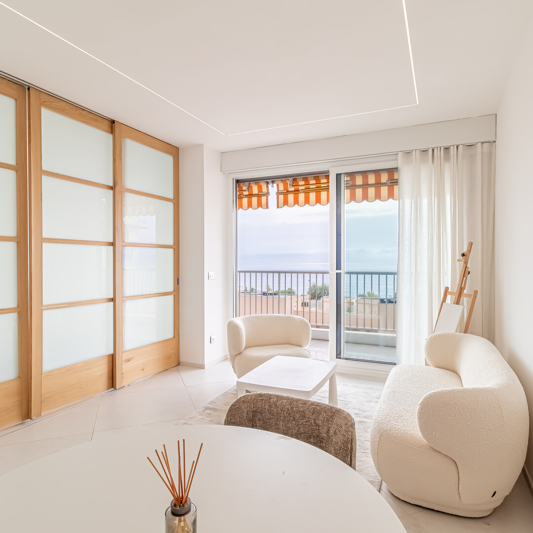 Completely renovated, this bright two-room apartment opens onto an entrance leading to a welcoming living room extended by a terrace with sea view. The open-plan kitchen, equipped with care, accompanies bright and functional living rooms. The bedroom has easy access to storage, complemented by a stylish shower room and guest toilet. The contemporary finishes and the fluid distribution reinforce the comfort of the whole.
