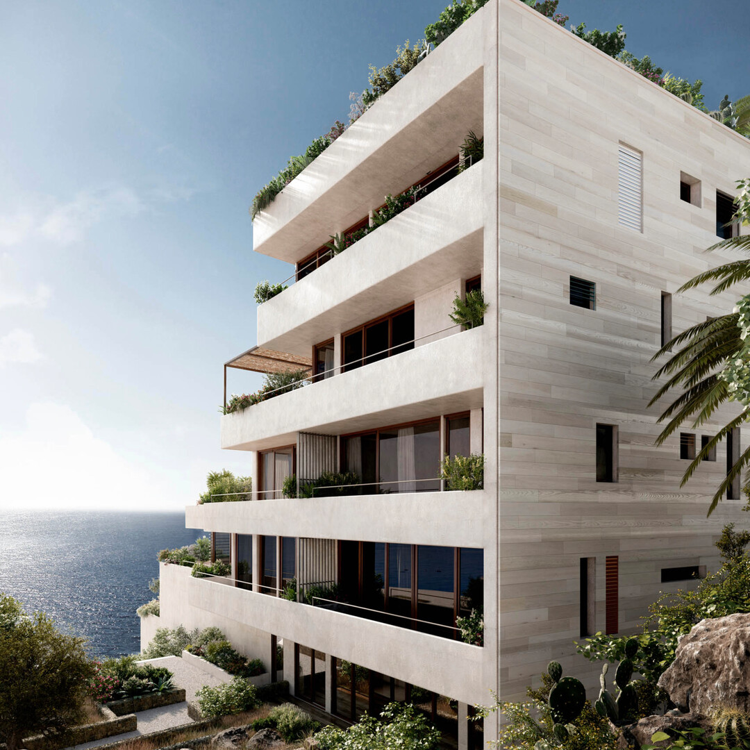 In a very recent residence with swimming pool and gym, wooded park with splendid sea view and located in the Jardin Exotique district.