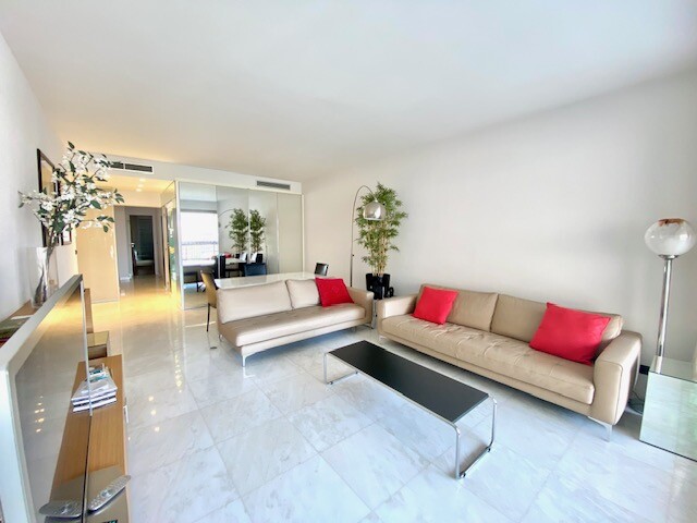 Floor-Through with double exposure, quiet (except during Grand Prix) and Sunny. Completely renovated by one of Monaco's leading decorators with high-end materials, air-con, marble floor. It consists of an entrance with cupboards, large living room with fitted kitchen opening onto large terrace on the garden side of the Casino, guest toilet, bedroom with dressing room and bathroom en suite, a spare bedroom with loggia and shower room, with both bedrooms overlooking west with wide view of the Old Town, mountains, and the Mediterranean. Large basement store-room and double parking included.