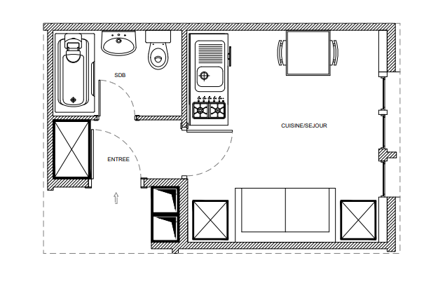 It is composed of: an entrance with cupboard, a main room, an unequipped kitchen space, a shower room.