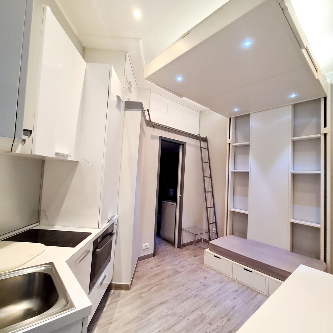 Studio  on the back of the building (on the 2nd subfloor) consisting of a main room with kitchenette, a bathroom with toilet. Furnished with custom-made furniture, it is the perfect pied-à-terre for one person