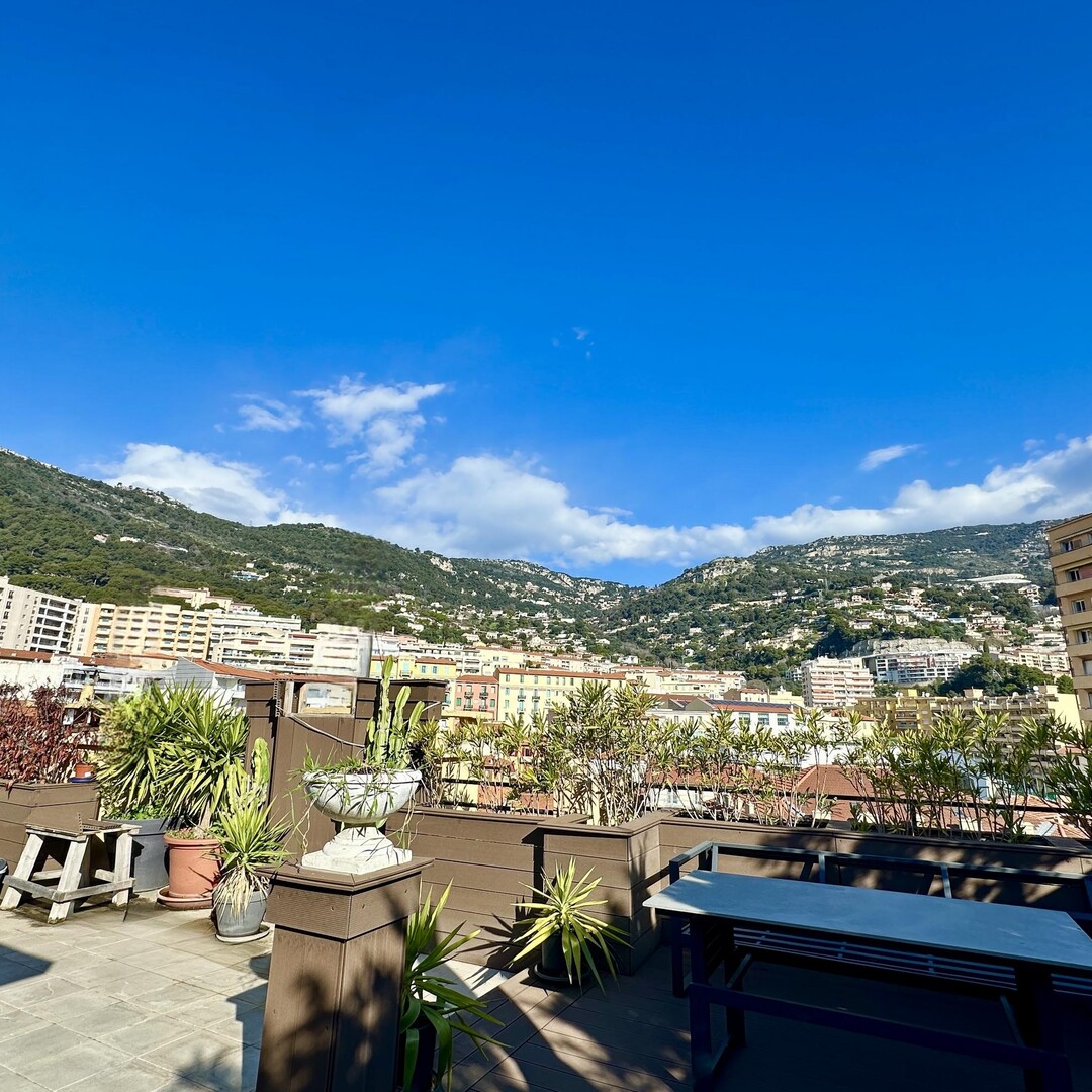 Penthouse with 2/3 rooms and a rooftop terrace in a charming bourgeois building located in the residential area of Boulevard de Belgique. This property features a beautiful entrance hall leading to a bright double living room, a fully-equipped, separate kitchen, a very pleasant terrace with a sea and Rock view, a master bedroom and a shower room. On the upper floor, there is an additional room, perfect for an office or a lounge, that opens onto a rooftop terrace with a bar and summer kitchen.The property is sold with a parking space at the neighbouring building Herakleia.