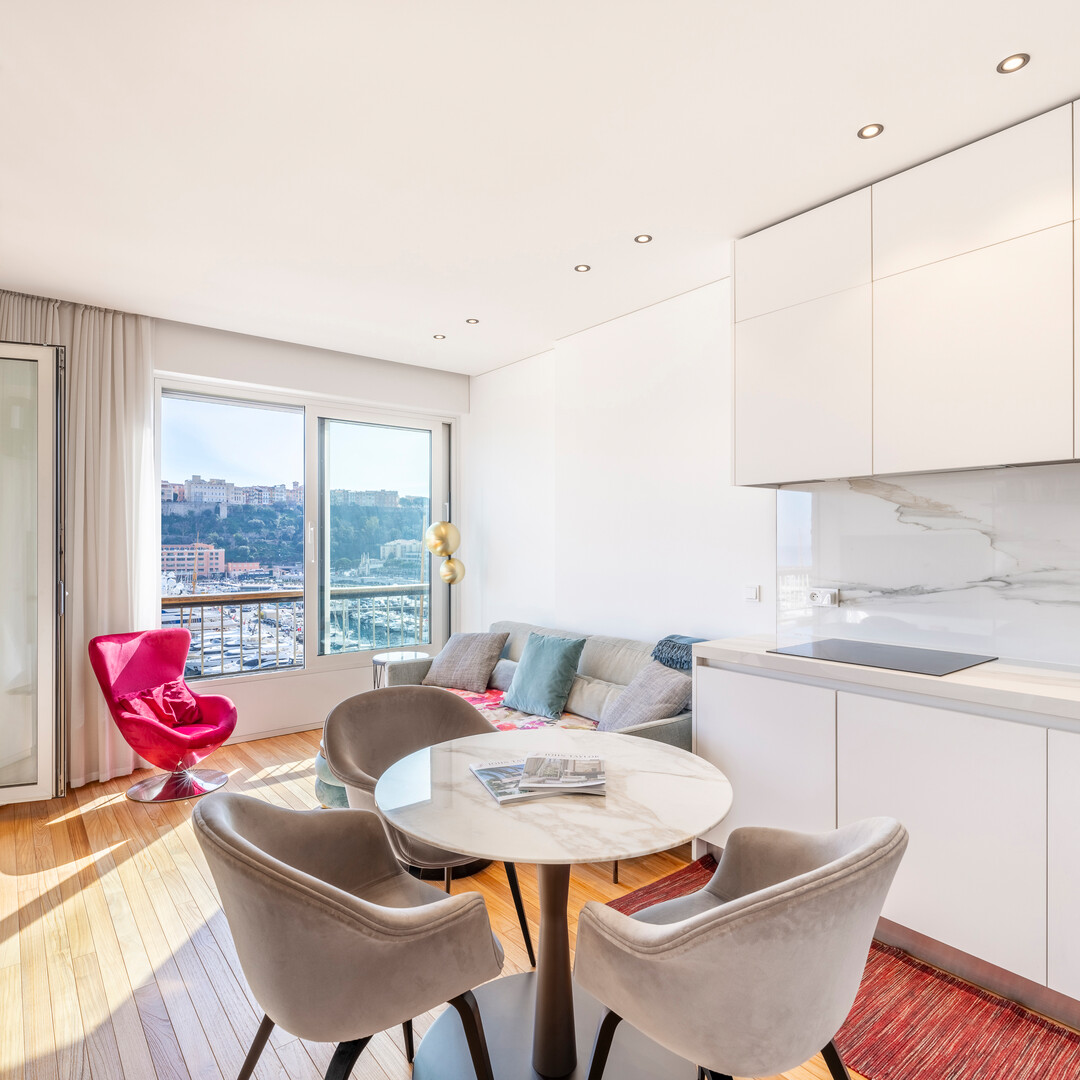 This superb 2-room apartment has been completely renovated and furnished with quality materials, also benefiting from an integrated home automation system. It consists of an entrance hall with cupboards, a living room with a fitted kitchen opening onto a beautiful loggia offering a panoramic view of Port Hercule, the Formula 1 circuit and the Rock. The sleeping area includes a full shower room, plenty of storage space and a bedroom opening onto the loggia.