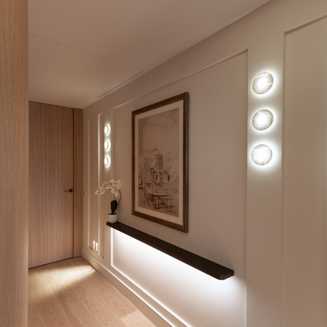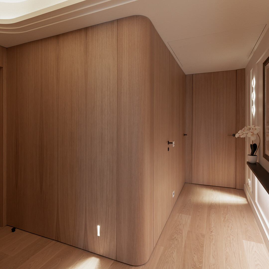 The spacious living room opens onto a landscaped terrace, offering uninterrupted views over Casino Square. The kitchen design and bespoke joinery integrate seamlessly throughout the apartment, creating a refined and cohesive living space. Kreon lighting enhances the atmosphere and highlights every detail.