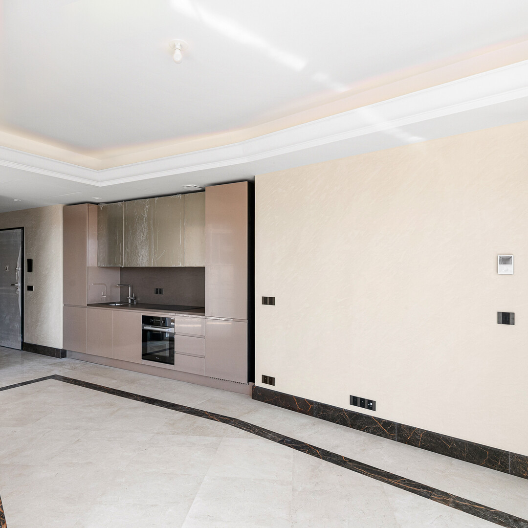 The high-end apartment features an entrance hall with built-in closet and interior lighting, a guest toilet with custom mirror and washbasin, a bright and airy living room with two different marble floors, stucco walls and a lighted cornice ceiling.