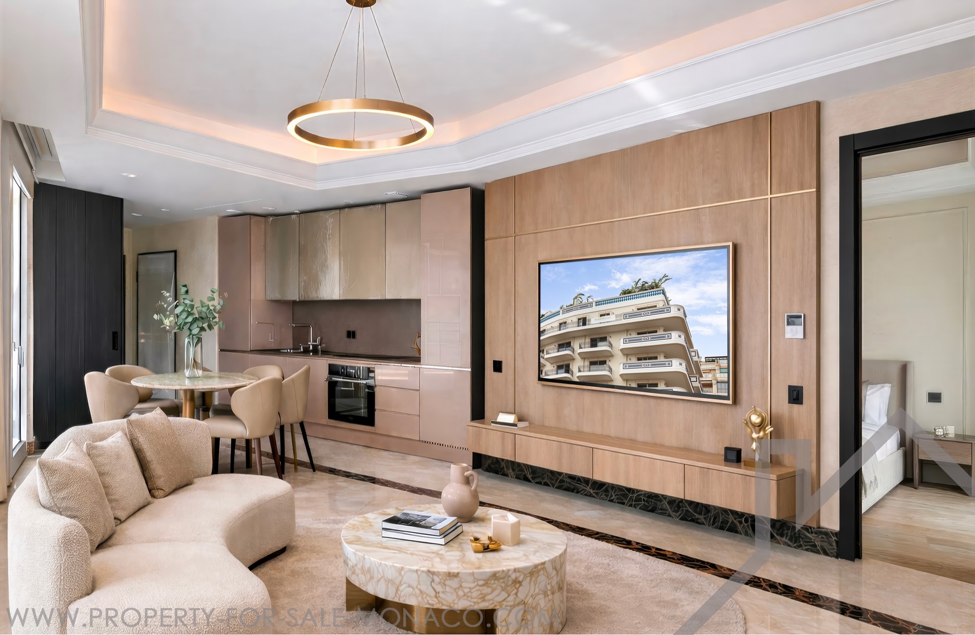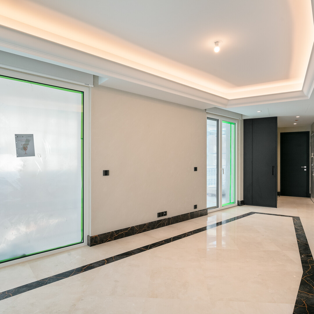The bright living room features two different marble floors, stucco walls and a backlit cornice ceiling.