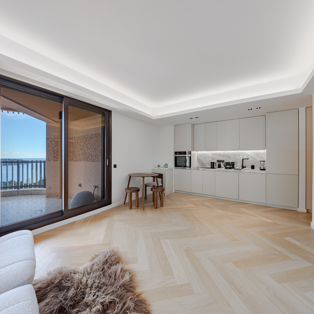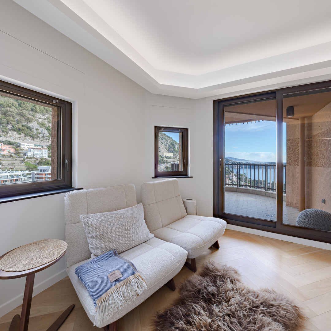 Sumptuous one bed-room apartment completely renovated with high quality materials and refined finishes. It offers an entrance with a corridor and custom-made storage, opening onto a sumptuous living room with a fully equipped open kitchen. The bedroom, with its luxurious en-suite bathroom and custom-made dressing room, offers absolute comfort. A large terrace reveals a breathtaking view of the sea and the majestic surrounding mountains.