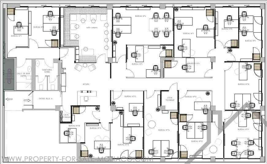 Located in the heart of Fontvieille, close to amenities, shops and beaches, magnificent office composed of a beautiful reception area, kitchen-tea room, 18 partitioned work spaces in soundproof glass, 3 bathrooms and a shower room with toilet, all furnished with high quality materials, potential annual rent of €520,000 excluding tax, air conditioned.