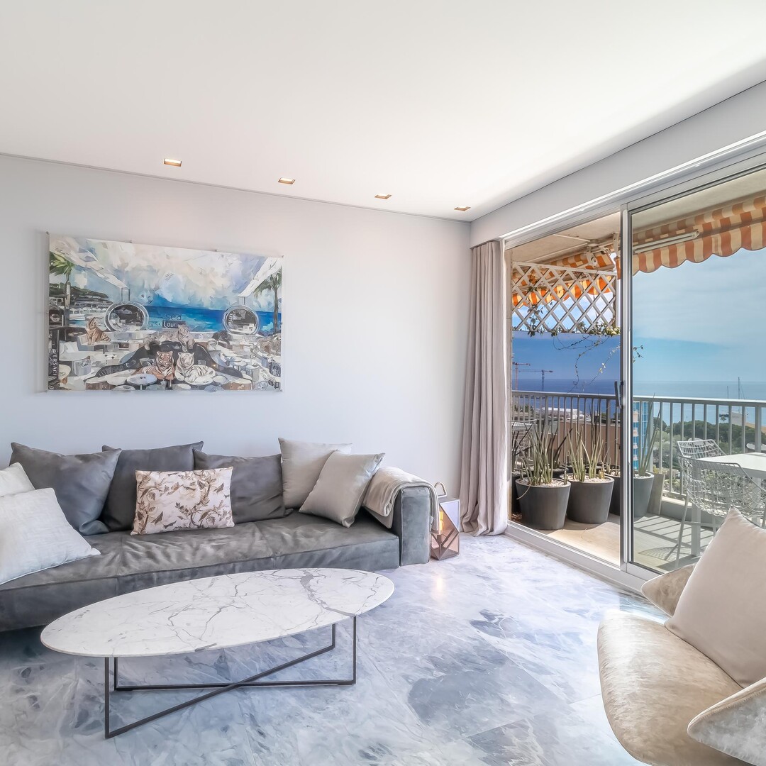 In the Château d'Azur building, this high-floor apartment has been fully renovated with high-quality materials. It offers a lovely view of the sea.