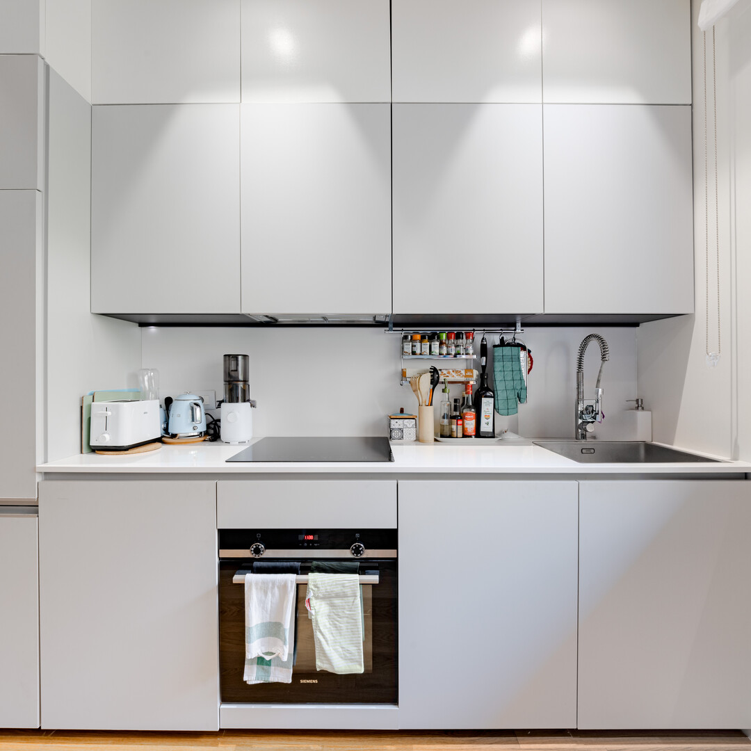 The bright and welcoming living room includes a brand-new open kitchen, creating a pleasant and perfectly optimised living area.