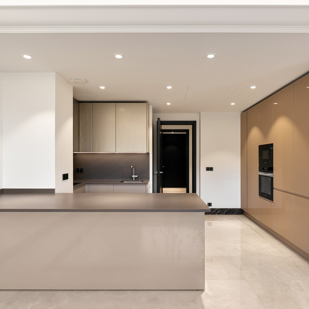 It comprises an entrance hall leading to a corner kitchen with island, opening onto a large living room with top-of-the-range finishes. Two different marble floors and backlit cornice ceiling with stucco mural.