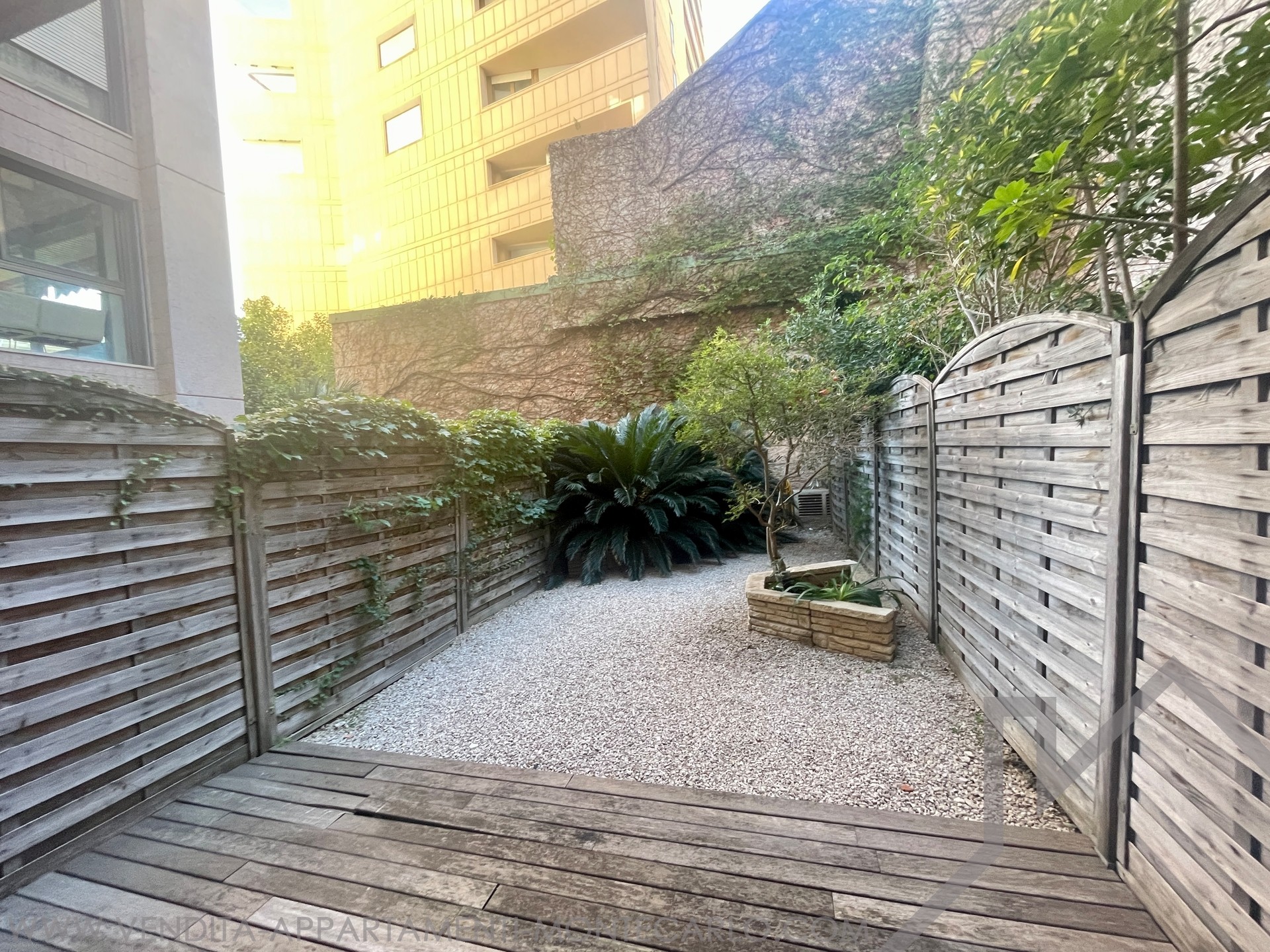 In a luxury residence in the heart of the Carré d'Or, large studio consisting of an entrance with storage, a main room, an independent fitted kitchen, a full bathroom, a terrace and a garden.