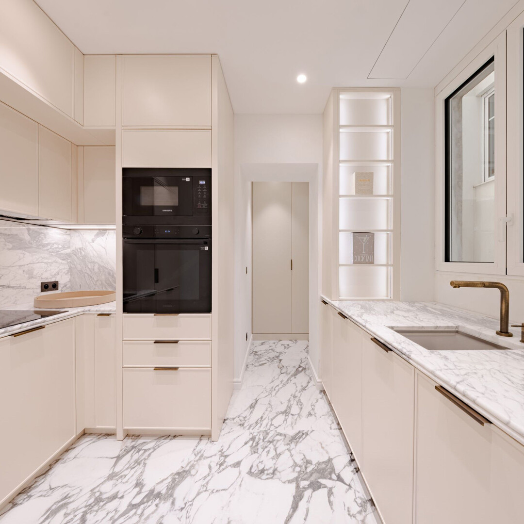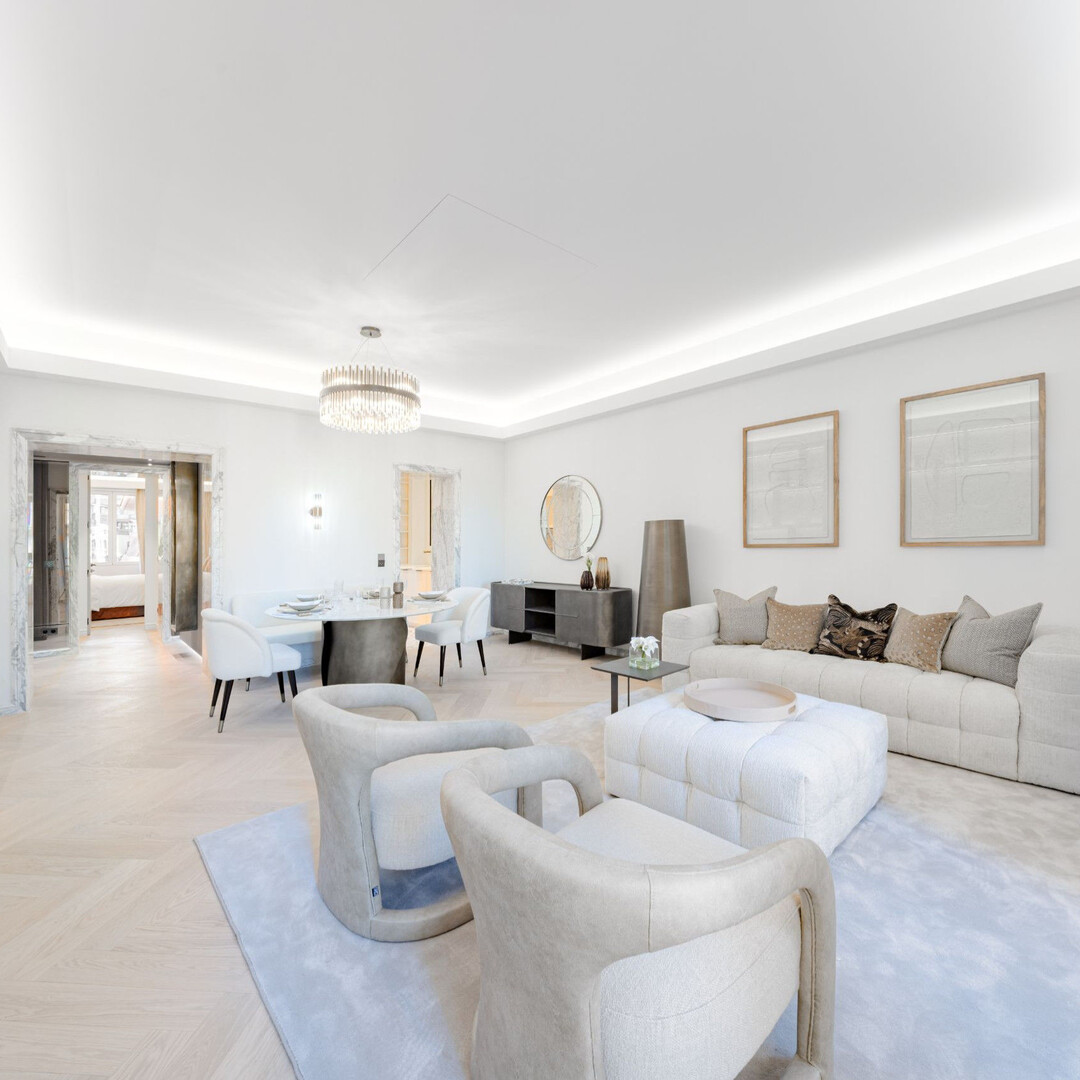 EXCLUSIVE In the heart of the Golden Square, this stunning three-room apartment has been fully renovated with high-end finishes. It consists of two bedrooms, each with its own ensuite shower room, as well as a guest toilet. Additionally, a fully equipped and fitted separate kitchen completes the apartment, along with a bright living/dining room that opens onto a balcony overlooking the Golden Square with a sea view. The apartment also includes a cellar.