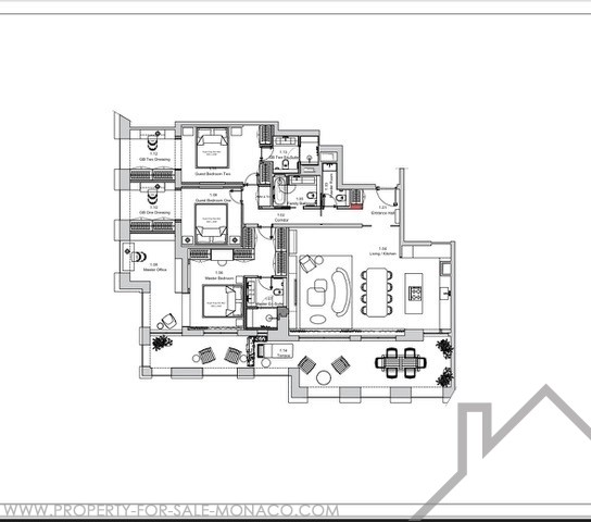 This spacious apartment features an entrance hall leading to a double living room with open, fully-equipped kitchen, a master bedroom with private bathroom, dressing room and study, two further bedrooms, two other shower rooms and study area, a guest toilet, and a deep terrace offering spectacular views of Cap d'Ail harbor.