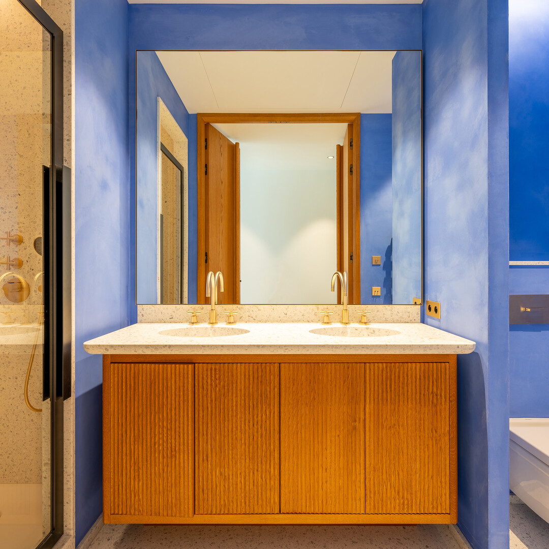 The apartment offers a large living room extended by a sea-facing terrace, a fully equipped modern kitchen, a laundry room, a guest toilet, as well as two en-suite bedrooms each with its own balcony and dressing room, also facing the sea.