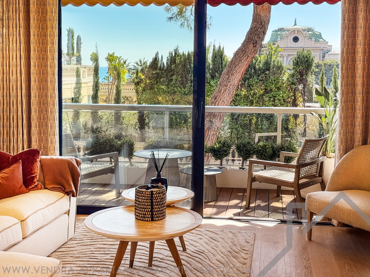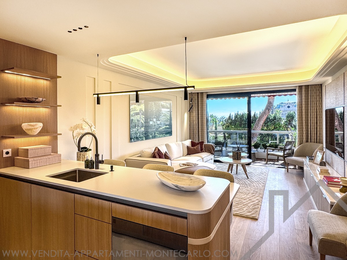 At the front, the living room and kitchen open onto the deep terrace overlooking the Casino de Monaco. Both bedrooms open onto a second landscaped terrace.