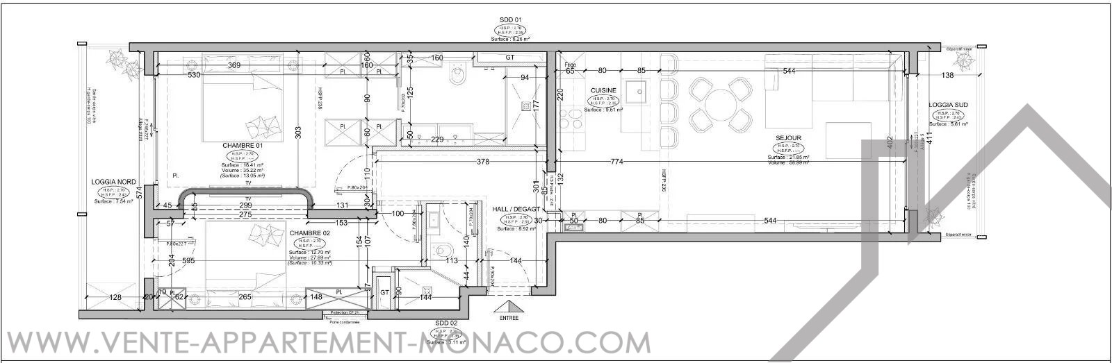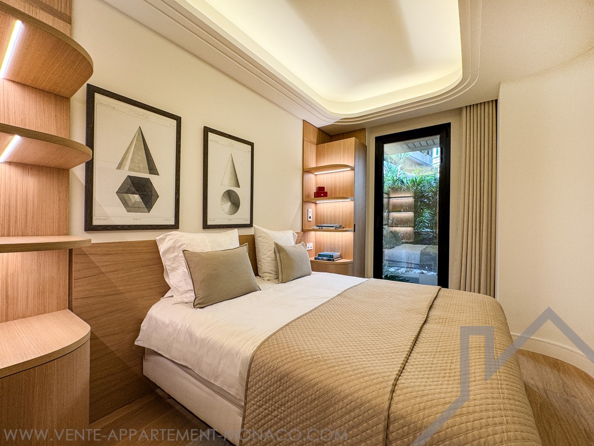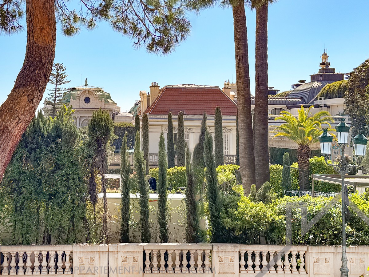 At the front, the living room and kitchen open onto the deep terrace overlooking the Casino de Monaco. Both bedrooms open onto a second landscaped terrace.