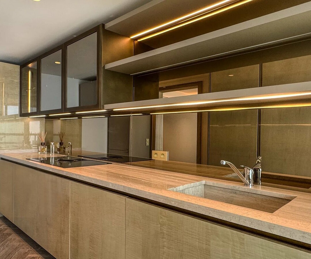 The spaciously designed living and dining area features an open layout and impresses with floor-to-ceiling windows, creating an exceptionally bright and inviting atmosphere. Elegant sliding glass doors lead to the private terrace, allowing for a seamless transition between indoor and outdoor living. Facing southeast, the apartment offers an incomparable, unobstructed panoramic view of the Mediterranean Sea.