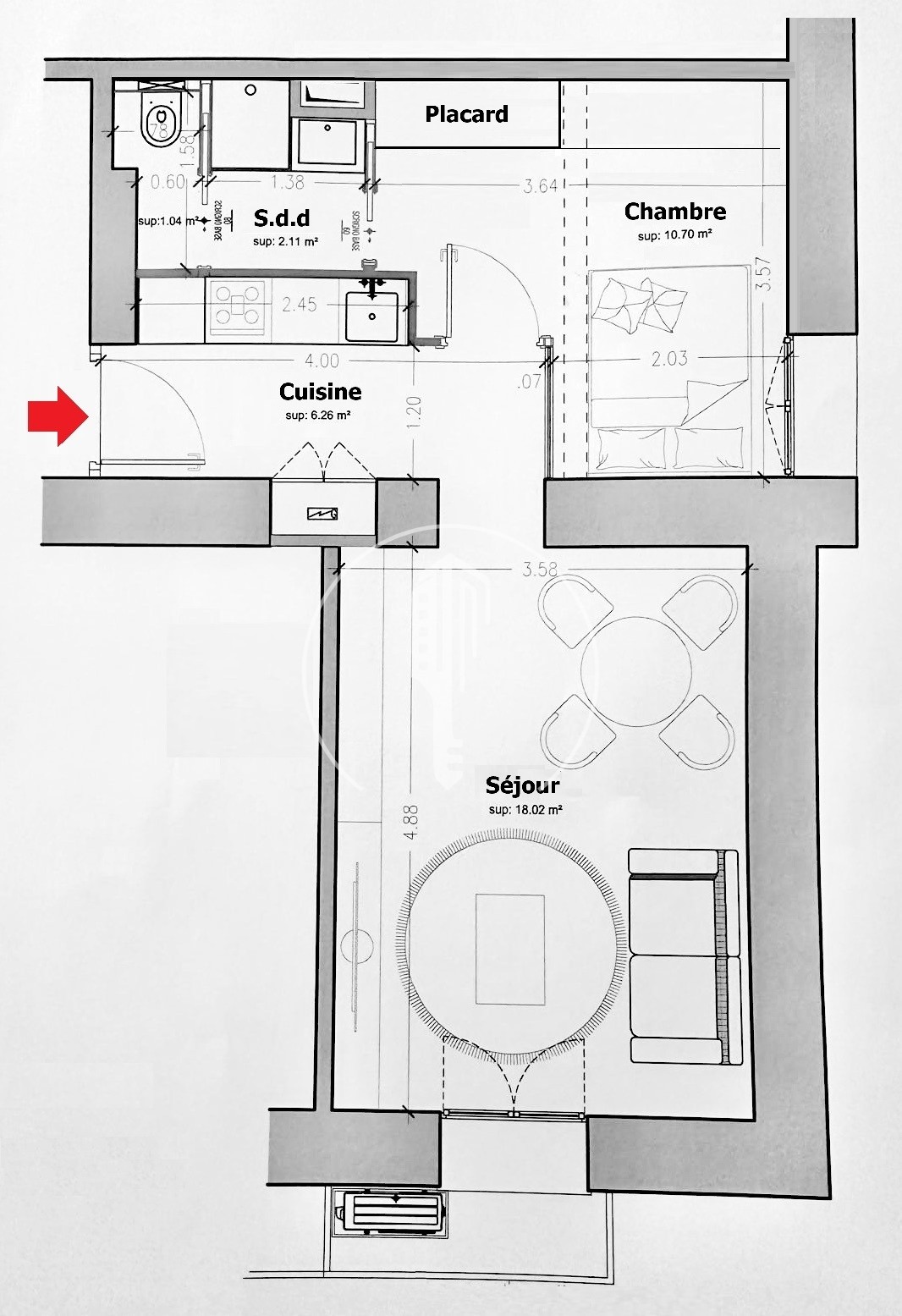 Entrance, equipped kitchenette, living room, bedroom with cupboard, shower room and toilets, air conditioning