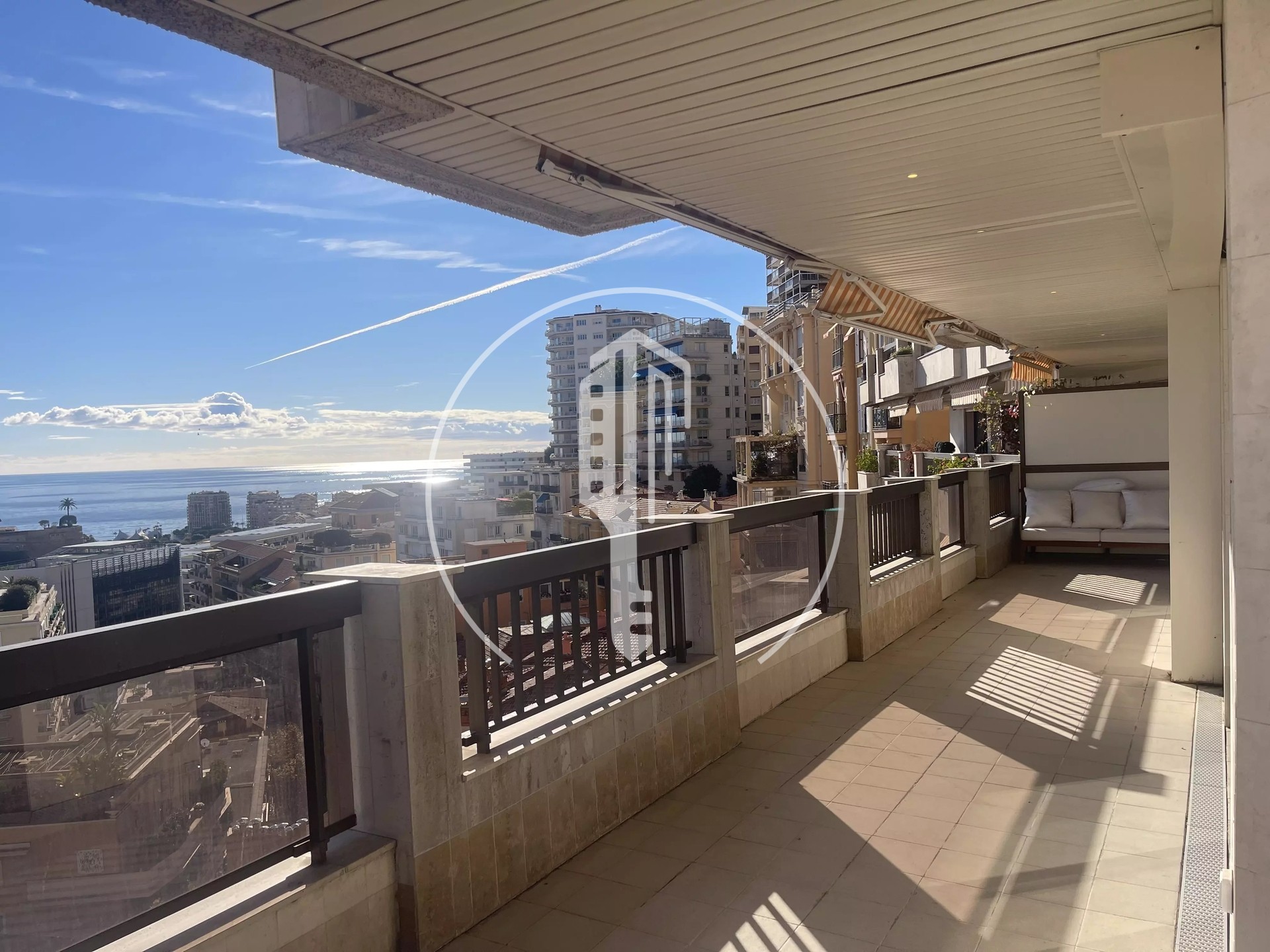 The property features two beautifully appointed bedrooms and three contemporary bathrooms, along with a fully equipped kitchen designed for both convenience and style. The bright, open-plan living spaces extend seamlessly onto a large wrap-around terrace, the highlight of the residence. From here, sweeping panoramic views unfold over Port Hercules, the shimmering yachts, and the iconic Rock of Monaco, offering a breathtaking backdrop day and night.