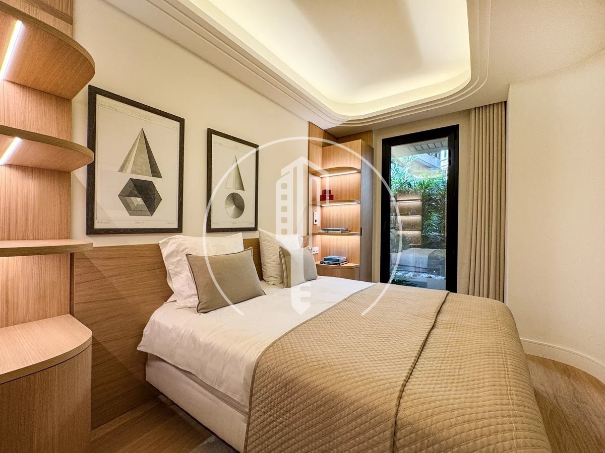 As you enter the elegant entrance hall, you'll discover a bright living room, complemented by a fully- equipped open-plan Bulthaupt kitchen, with Miele appliances throughout. The living room is fitted out with refined furnishings, complemented by beautiful bespoke shelving, while opening up onto a landscaped terrace exhibiting views of casino square.