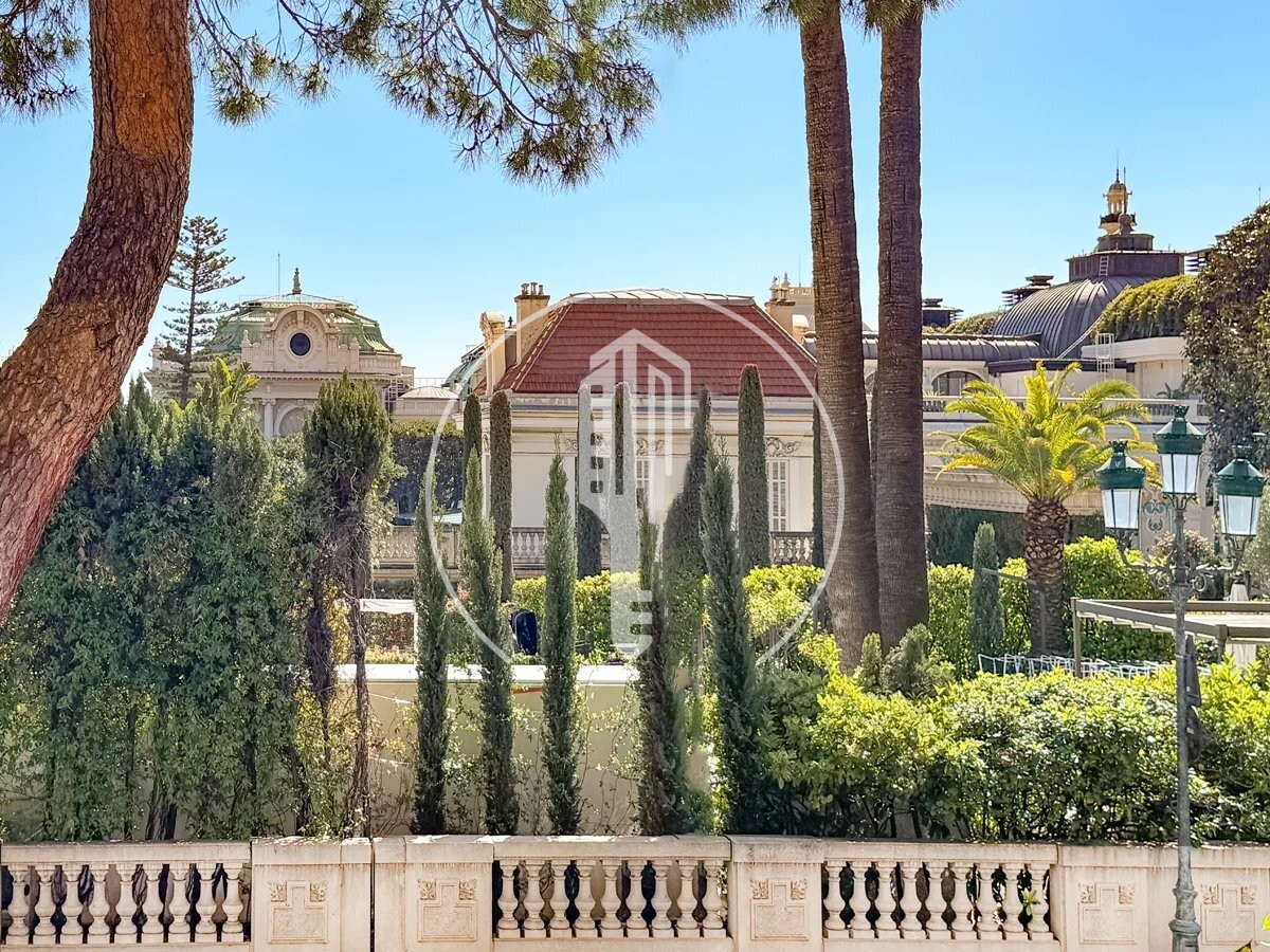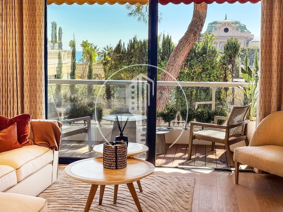 At the front, the living room and kitchen open onto the deep terrace overlooking the Casino de Monaco. Both bedrooms open onto a second landscaped terrace.