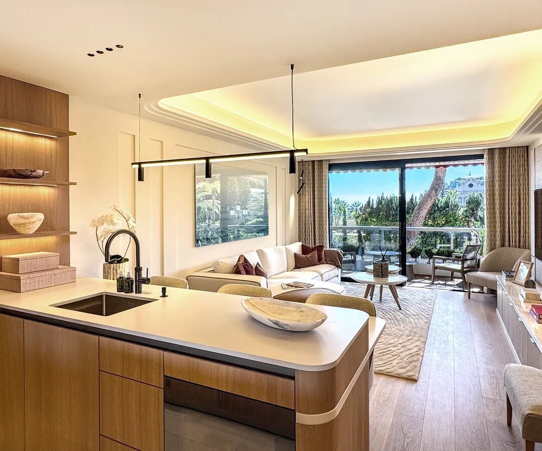 As you enter the elegant entrance hall, you'll discover a bright living room, complemented by a fully- equipped open-plan Bulthaupt kitchen, with Miele appliances throughout. The living room is fitted out with refined furnishings, complemented by beautiful bespoke shelving, while opening up onto a landscaped terrace exhibiting views of casino square.