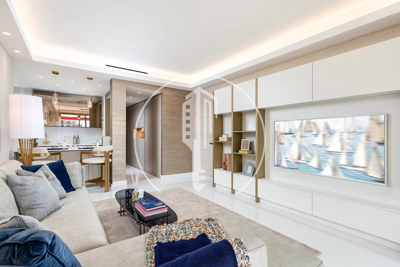 The entrance to this apartment immediately reveals the refinement of the product, and continues into the luminous living room, decorated and furnished with particular attention to detail.