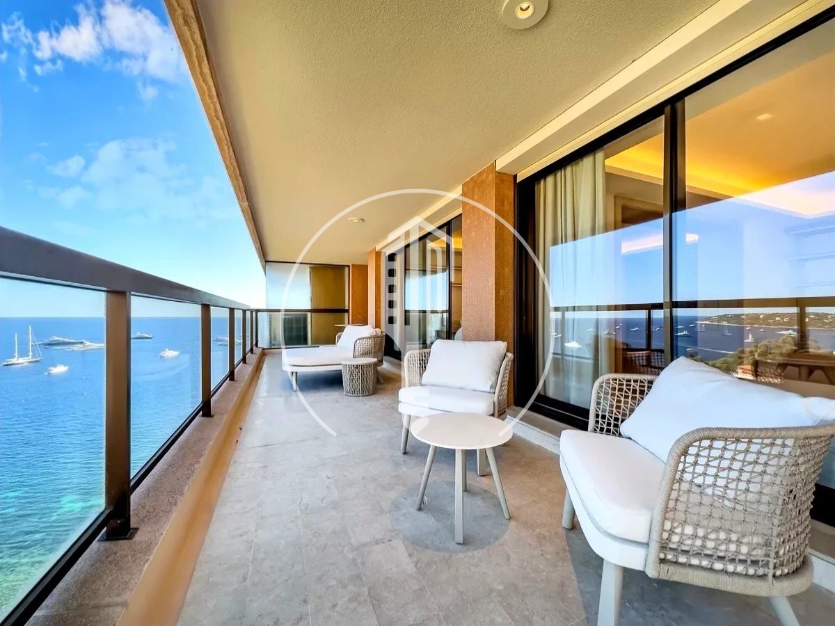 The spacious terrace opens onto a spectacular panoramic view of the Mediterranean Sea and Cap Martin—an expression of refined living at its finest.