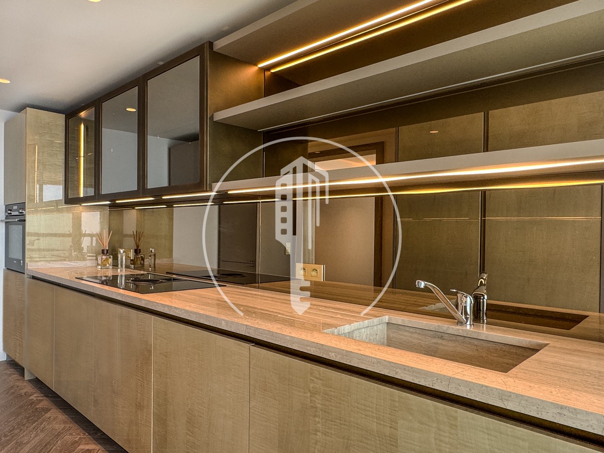 The spaciously designed living and dining area features an open layout and impresses with floor-to-ceiling windows, creating an exceptionally bright and inviting atmosphere. Elegant sliding glass doors lead to the private terrace, allowing for a seamless transition between indoor and outdoor living. Facing southeast, the apartment offers an incomparable, unobstructed panoramic view of the Mediterranean Sea.
